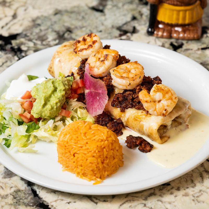 A crispy deep-fried flour tortilla stuffed with your choice of meat and topped with cheese dip. Served with crema, salad and your choice of rice or beans • Chicken $12.99 | Beef $13.99 | Shrimp $14.99