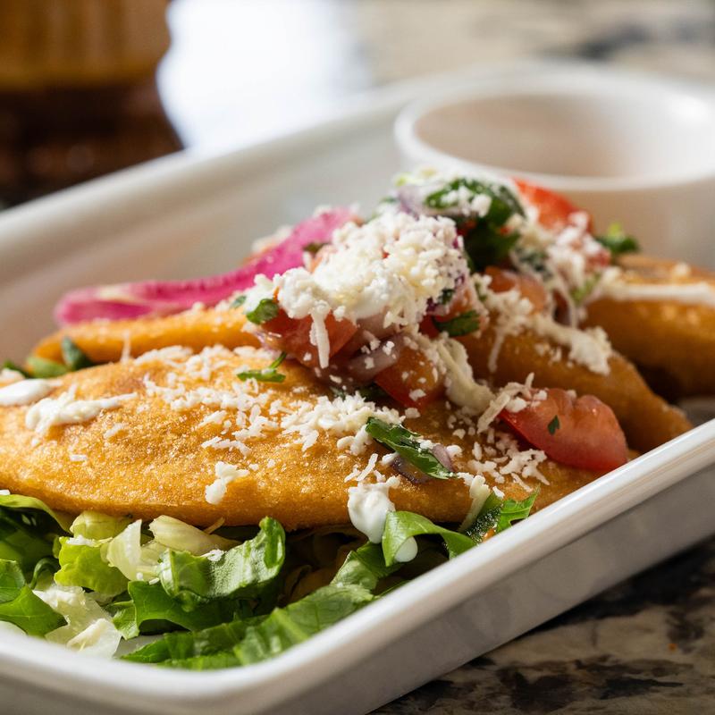 Four crispy rolled tacos, filled with your choice of our juicy Chicken Tinga or Beef Birria, served over a bed of lettuce and topped with crema, queso fresco, and our avocado salsa.