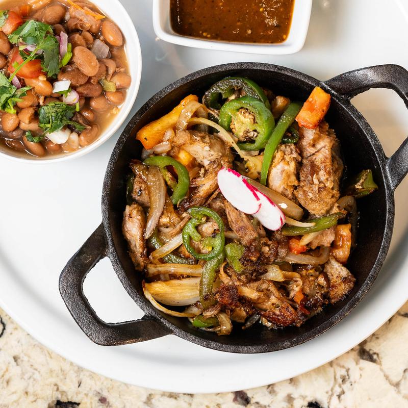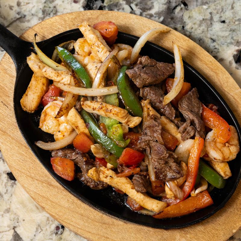 The classic griddle experience. Arriving at your table in a cast-iron skillet, releasing aromatic steam over a bed of caramelized peppers and onions. Served with rice, beans, guacamole, sour cream, and handmade tortillas for you to build the perfect taco.