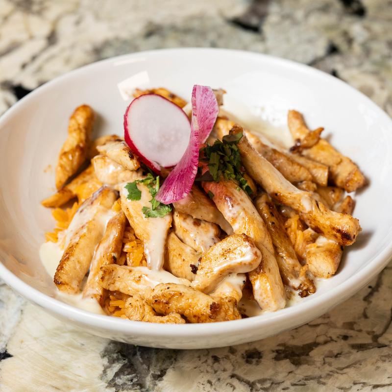Juicy grilled chicken, crispy smoked bacon, and melted cheddar cheese over seasoned rice. We swap the smoke for zest with our house-made Cilantro-Lime Sauce and add crispy fried onions for an irresistible, savory crunch in every bite.
