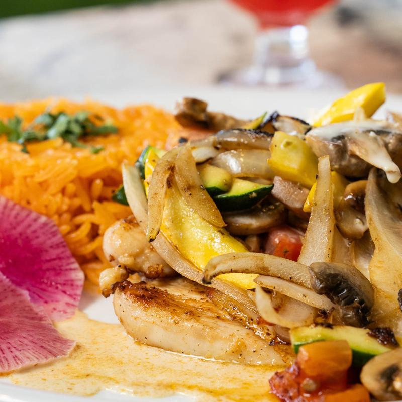 Grilled chicken breast with onions, mushrooms, squash, and grilled tomatoes. Topped with cheese dip. Served with rice.